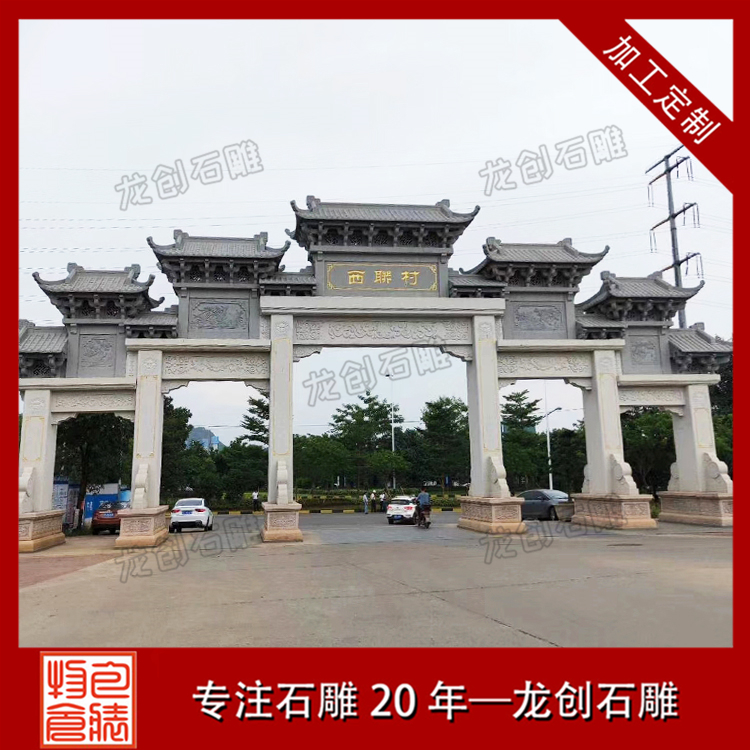 隨著新農(nóng)村建設(shè)越來越多,農(nóng)村村口牌坊制作被廣泛使用,這種精美的石牌坊建筑安裝在鄉(xiāng)村的出入口已經(jīng)成為了美麗鄉(xiāng)村的景觀標志,農(nóng)村村口石雕牌坊不僅能起到美化農(nóng)村風景的作用,還是一個威武的村莊名字的標志,更能起到標志引導的作用,另外還能憑借石牌坊的文化內(nèi)涵來提升村莊的整體形象以及文化品位。一座村口牌坊制作要多少錢?通過以下四大要素我們能很清楚的了解農(nóng)村村口牌坊價格如何預算報價。