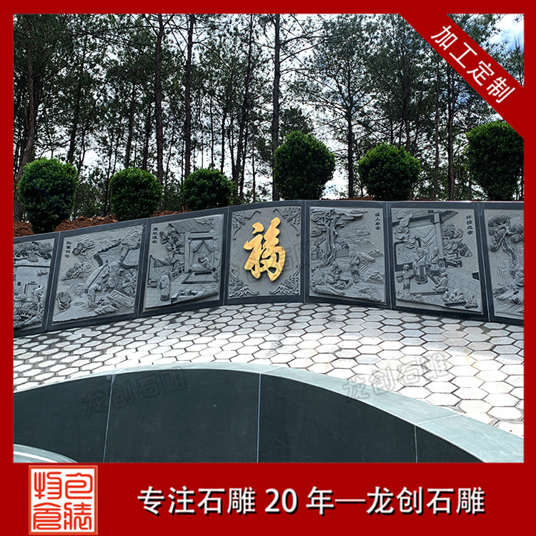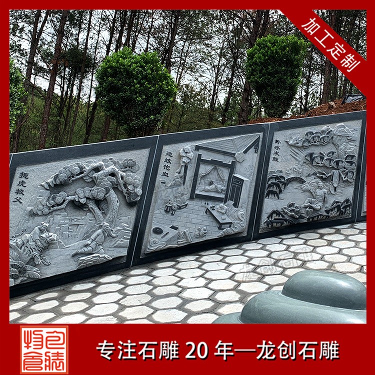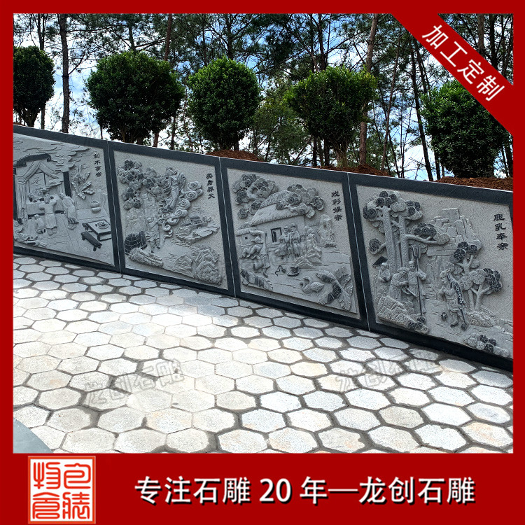 在墓園會(huì)使用到的石雕制品有很多,除了我們一開(kāi)始會(huì)想到的石雕墓碑以外,還有些墓園會(huì)安裝石雕欄桿和石雕涼亭、石雕浮雕,墓園石雕欄桿除了起到安全防護(hù)作用外,還具有裝飾作用,而石雕涼亭的主要作用就是供人休息用的,石雕浮雕主要作用就是裝飾了,此套石雕墓圍的浮雕圖案是二十四孝。