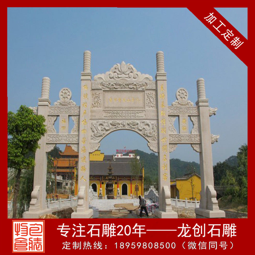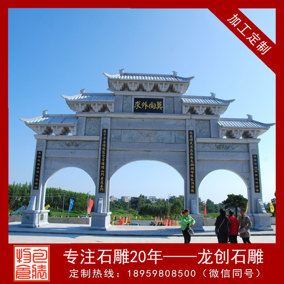 石雕山門是漢族傳統建筑中非常重要的一種建筑類型,用花崗巖修建的石雕山門,是封建社會為表彰功勛、科第、德政以及忠孝節義所立的建筑物。也有一些宮觀寺廟以山門作為山門的,還有的是用來標明地名的。又稱牌樓,為門洞式紀念性建筑物,宣揚封建禮教,標榜功德。建筑是凝固的歷史。