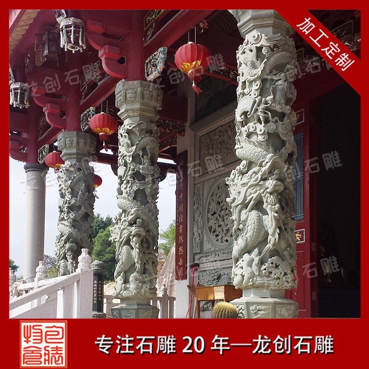 寺廟石龍柱在選擇石材上面建議使用天青石,因?yàn)樘烨嗍@種石材顏色比較接近古建筑,和廟宇、祠堂、寺院比較搭配,石龍柱雕刻是以龍的形象作為根本,在石柱上進(jìn)行雕刻,更好的展現(xiàn)出龍的各種樣式,就這樣簡(jiǎn)單的一根石柱子,上面雕刻了不僅是龍的造型這么簡(jiǎn)單,其實(shí)里面蘊(yùn)藏了很多文化。是我們龍的傳人的內(nèi)涵。