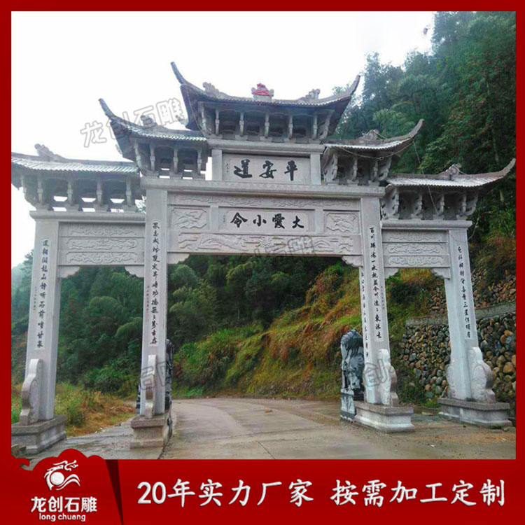 村口牌坊牌樓作為提升農(nóng)村形象的重要建筑物,在選擇上要綜合考慮,農(nóng)村修建村口門樓一般以簡單大方為主,而村口門樓分為有樓的和沒樓的兩種樣式,門數(shù)又分為一門石牌樓、三門石牌樓、五門石牌樓等。村口門樓一般一門一樓三樓或三門三樓五樓七樓較為常見,五門的很少見。石牌樓常見的這幾種樣式也是農(nóng)村人都非常喜歡的,原因一簡單大方,原因二價格實惠,這兩點很重要。