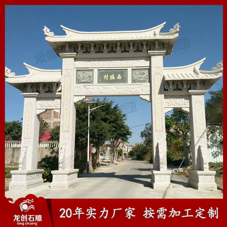 村口牌坊牌樓石雕的興起是一種盛世的象征。村口石牌樓體現(xiàn)了農(nóng)村經(jīng)濟繁榮、設(shè)施完善、環(huán)境優(yōu)美、文明和諧的社會主義新農(nóng)村的核心價值,這也是社會主義新農(nóng)村建設(shè)的成功見證之一。
