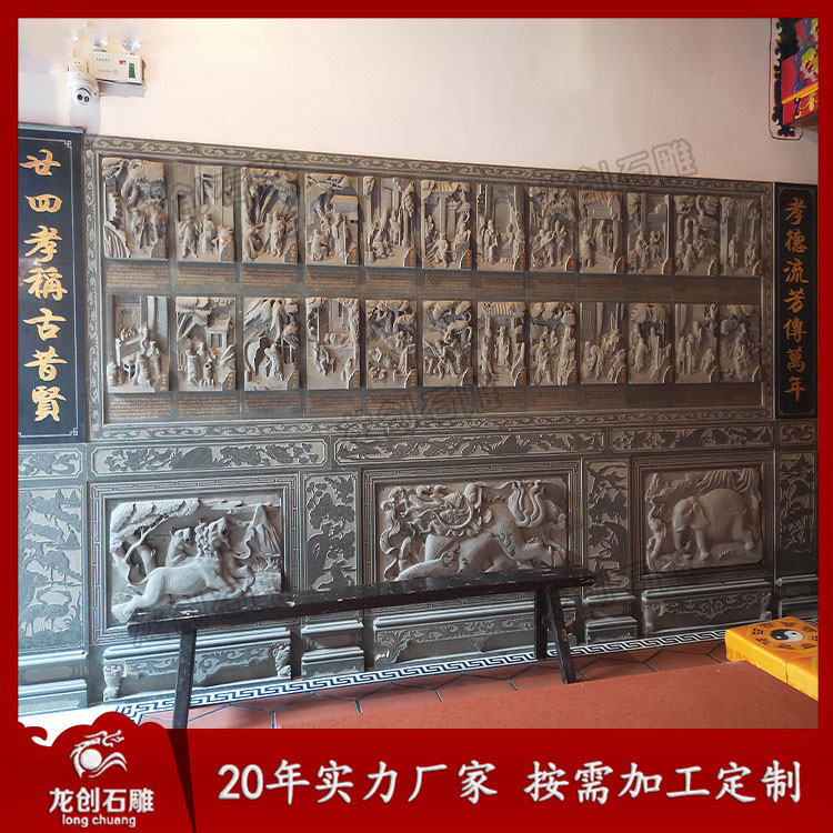還有一些地方會雕刻一些人物故事之類的浮雕,例如我國傳統二十四孝浮雕,也會被雕刻在祠堂石材浮雕上,可以提醒子孫應該孝順。又或者是一些宗祠有一些當地傳說或者故事,也得會雕刻在上面。