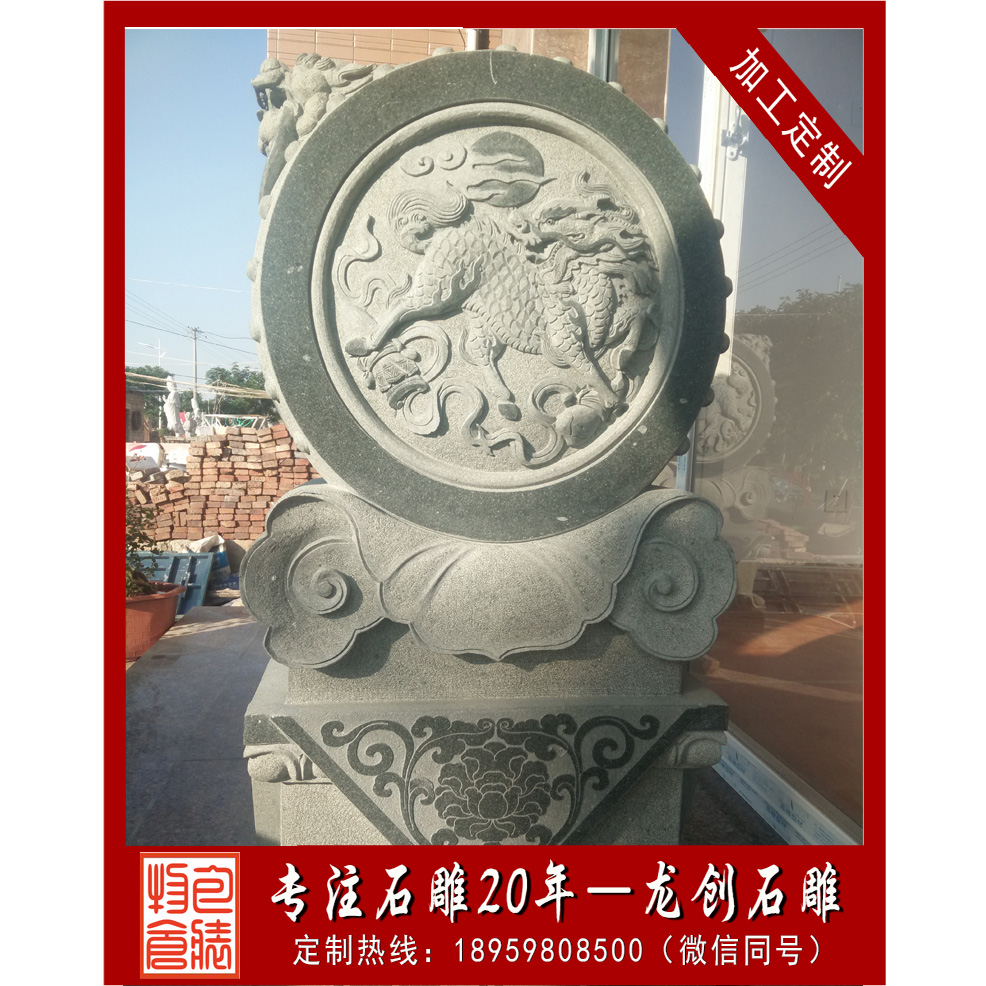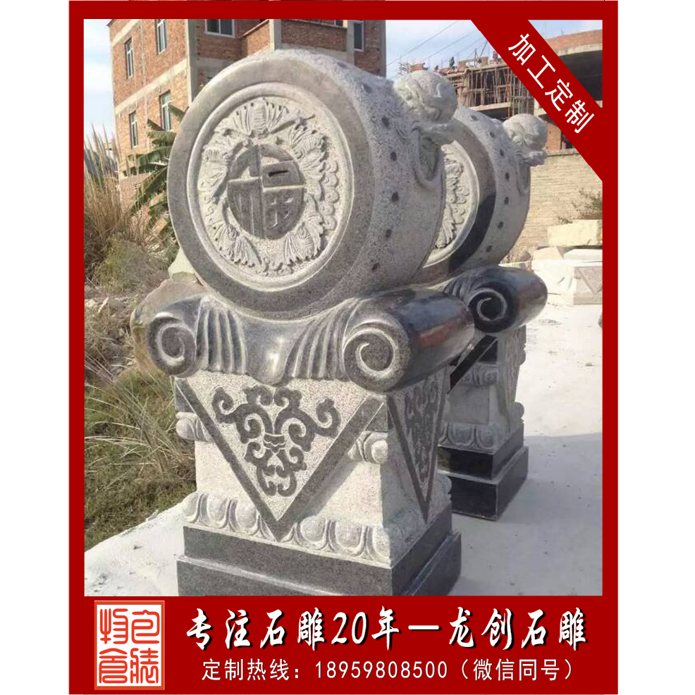 抱鼓石上雕刻麟、鳳、鹿、鶴、猴、鵲、蜂等瑞獸祥禽,形神兼備,姿態各異。如麒麟臥松、犀牛望月、獅子舞繡球、鶴鹿同春,還有三獅戲珠(三世戲酒)、四獅同堂(四世同堂)、五獅護欄(五世福祿)等圖案。另有在門前單獨立石獅,借助獅子的威猛守護大門,又因“獅”與“事”諧音,便以雙獅寓意“事事如意”、“事事平安”。守門的石獅,雄左雌右,雄獅腳下按一繡球,母獅腳下按一幼獅,繡球象征權力,幼獅象征子嗣,即表示“子嗣昌盛,世代為官”。