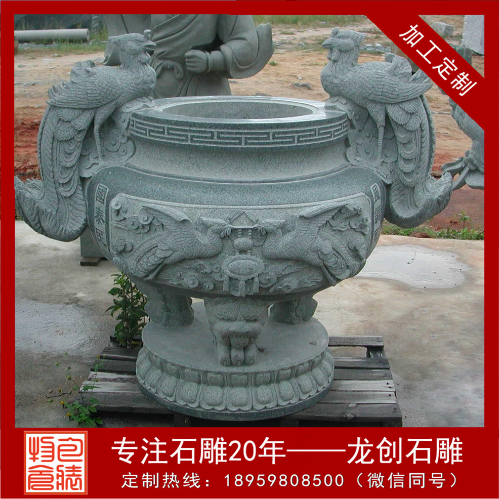 石雕香爐在亞洲社會歷史久遠,本來只供焚香用,現在由于社會進步和石雕產業的發達石香爐逐漸成了藝術品了。形狀上常見為方形或圓形,方形的石香爐一般有四足;圓形的石香爐,都有三足,一足在前,兩足在后放置。