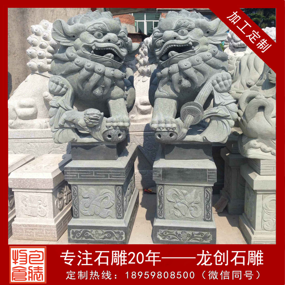 石獅子的造型一般尊嚴而又大氣,是皇jia守衛門戶確保皇宮安寧的瑞獸,因為獅子是獸中zhi王,它體態壯碩雄健、威錳無比、氣勢非常。統治者認為獅子不但可以避邪,還可帶來祥瑞之氣。石雕北京獅為雌雄一對,獅頭飾鬃髦,頸懸響鈴,肌肉發達,氣勢雄偉。雌獅前左腳下有一幼獅仰臥作嬉戲狀,雄獅前右腳撫踩一繡球。底座有繁縟精致的卷葉紋。石雕北京獅瑞獸一種,百獸zhi王,勇不可擋,威震四方,不但可以避邪,且可帶來祥瑞之氣,能解除多種形煞,亦加強官威或屋主之陽氣,如果窗口見到不利之沖克,如沖煞、天斬煞等,可放一對石獅面向口可化煞,且有生權之意,適合官職人員擺放,古時衙門前就是擺放獅子鎮守。