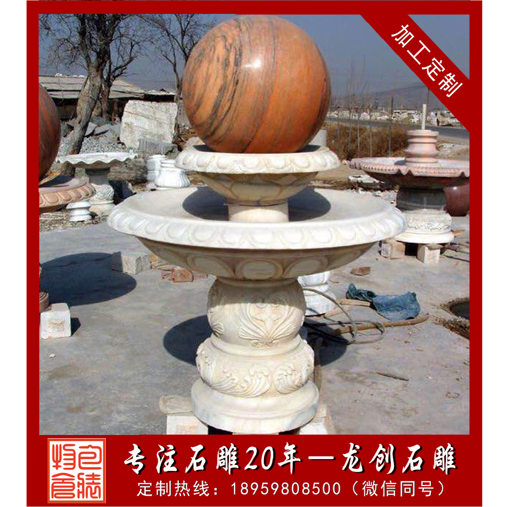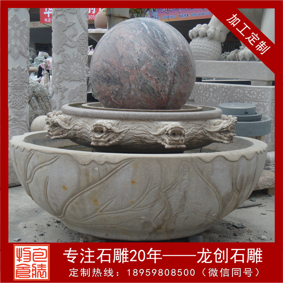石材風(fēng)水球是常見的風(fēng)水物品,是人們的信仰所在。風(fēng)水球通常為圓形狀。通常有放在陽臺欄桿上、圍墻上、及噴泉上,給人們帶來好運。生命在于運動,滾動顯示靈氣。設(shè)置于家中,生動有趣,增添靈氣,點綴生命之光彩;如將大型風(fēng)水球安裝于賓館、寫字樓、會場別墅門庭,增添氣勢,象征生機勃勃,財源滾滾。風(fēng)水球石料有大理石、花崗巖、漢白玉、砂巖等。風(fēng)水球造型比較多樣,常用的為流水缽式風(fēng)水球,及底托為圓盤形,此類風(fēng)水球可單層風(fēng)水球、雙層風(fēng)水球、三層風(fēng)水球、多層風(fēng)水球。除此之外還有方形風(fēng)水球、蓮花風(fēng)水球、花型風(fēng)水球等等。