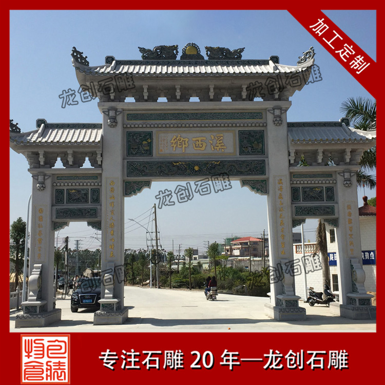 農(nóng)村大門牌坊定做當然在材質(zhì)的選擇上都比較講究,為保障牌坊本身的美觀性和牢固性,在材料挑選上也都有非常高的要求。綜合現(xiàn)在牌坊的雕刻看,主要用料有青石、花崗石、大理石等,要說比較合適的牌坊雕刻用料,還是以花崗石為主,花崗石的材質(zhì)比較堅固,花色也都比較多,能夠雕刻出更為細致的村口牌坊作品。